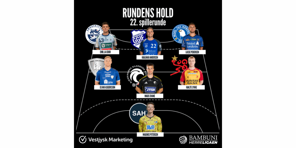 Elvar Ásgeirsson leikmaður Ribe-Esbjerg og íslenska landsliðsins er í liði 22. umferðar dönsku úrvalsdeildarinnar í handknattleik eftir stórleik sinn með Ribe-Esbjerg í sigrinum á TTH Holstebro síðasta fimmtudag, 39:31, í Holstebro.