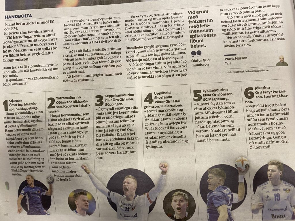 M.a. er rætt við hjónin Tinna Mark Antonsdóttir Duffield sjúkraþjálfara sem hefur verið mótshöldurum innan handar varðandi mótttöku Íslendinganna, og Ólaf Andrés Guðmundsson fyrrverandi landsliðsmann og einn dáðasta handknattleiksmann í sögu IFK Kristianstad. Auk þess er margskonar fróðleikur og upplýsingar fyrir íslenska gesti mótsins. Einnig er íslenska landsliðinu gerð góð skil sem verður greinilega lið heimamanna í Kristianstad næstu daga.