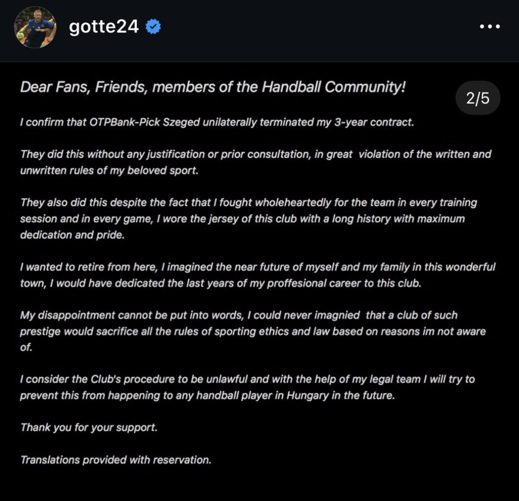Gottfridsson kom til Pick Szeged á síðasta ári eftir að hafa skrifað undir þriggja ára samning. Hann segist hafa séð fyrir sér að ljúka ferlinum hjá félaginu. „Mér er orðavant,“ segir Gottfridsson m.a. í tilkynningu sinni en hana er að finna hér fyrir neðan.