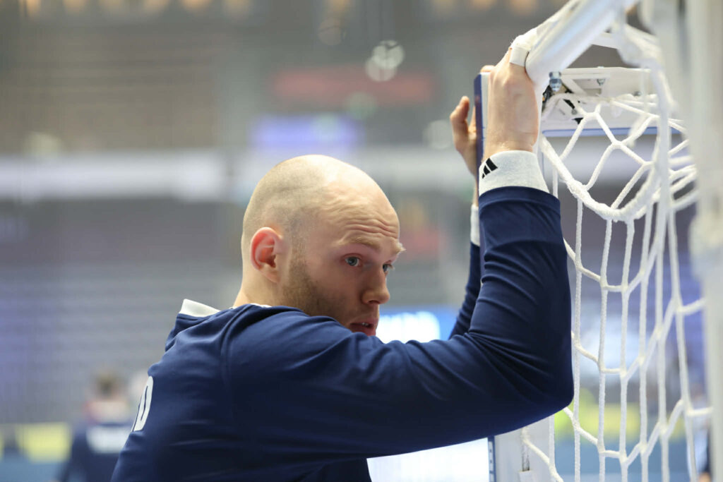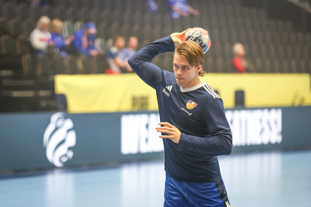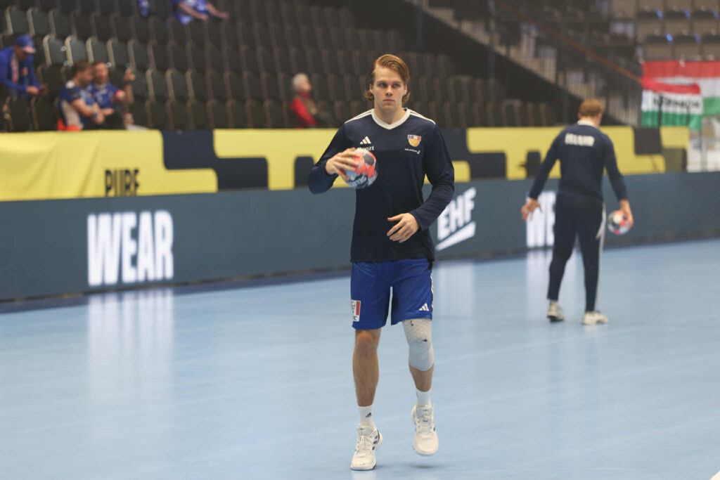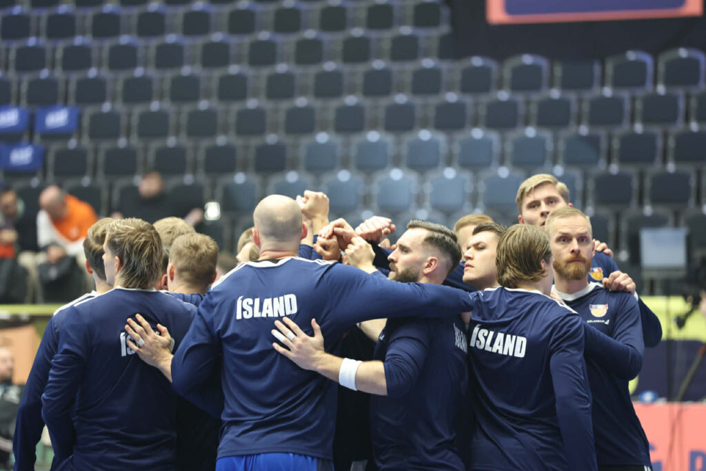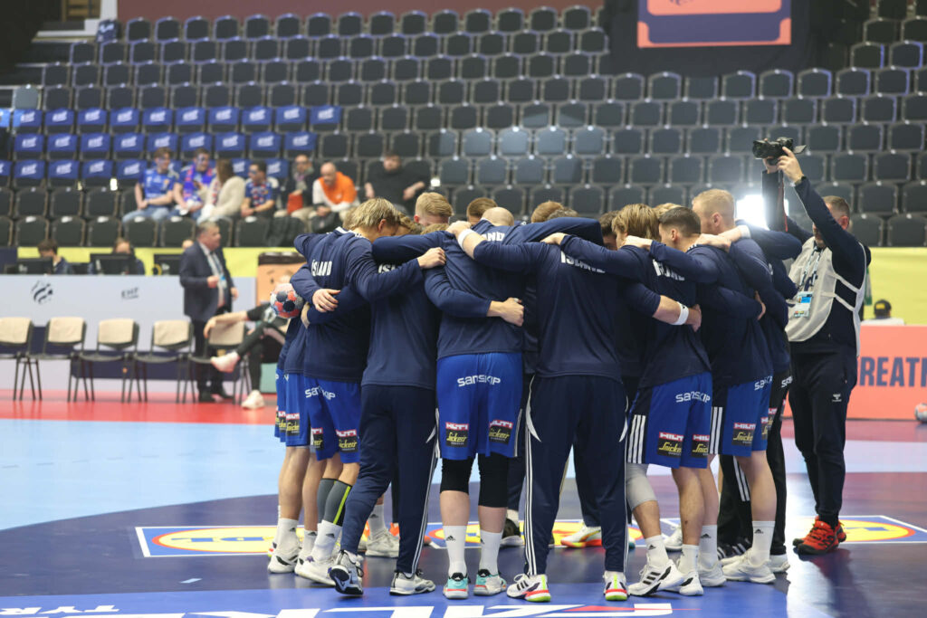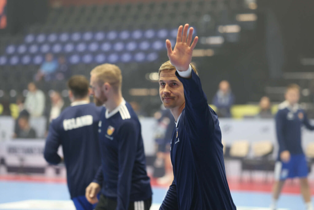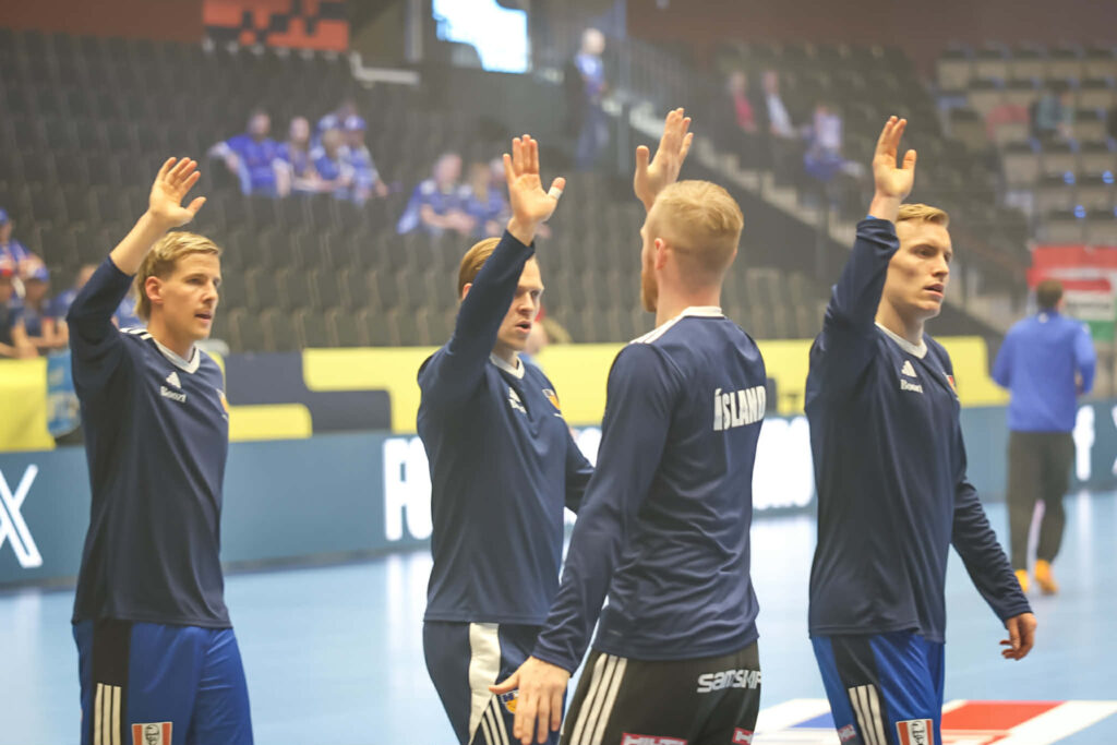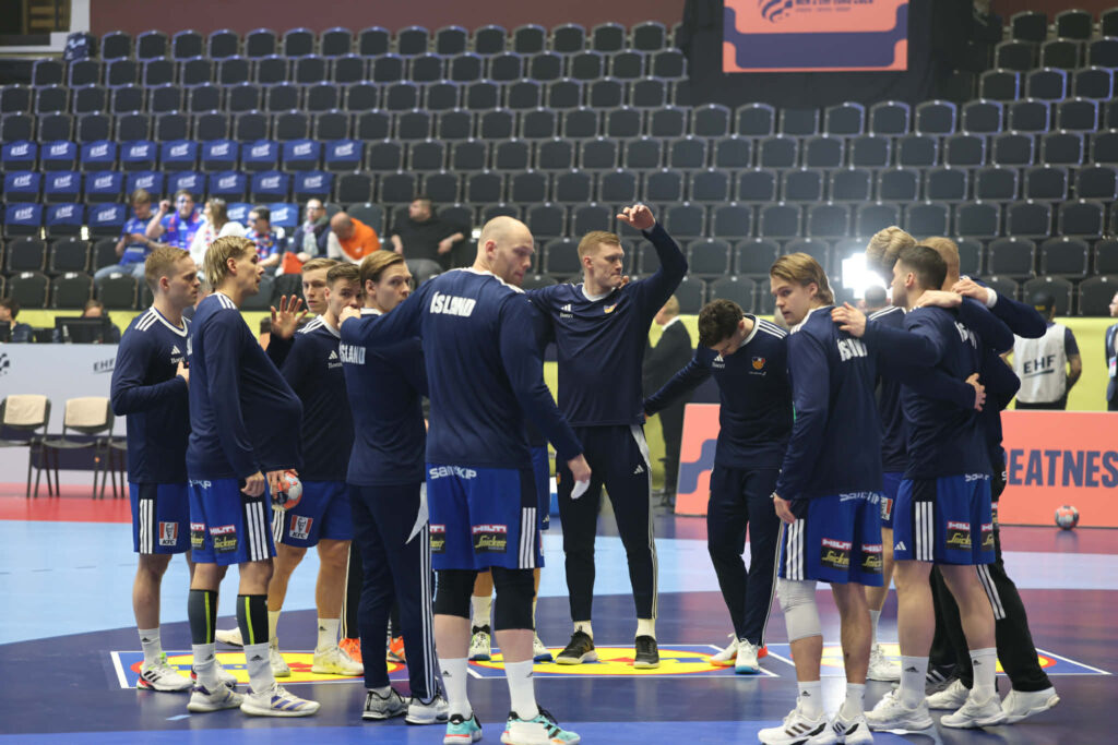 Hafliði Breiðfjörð ljósmyndari er í keppnishöllinni og smellti nokkrum myndum af íslensku leikmönnunum við upphitun fyrir leikinn.