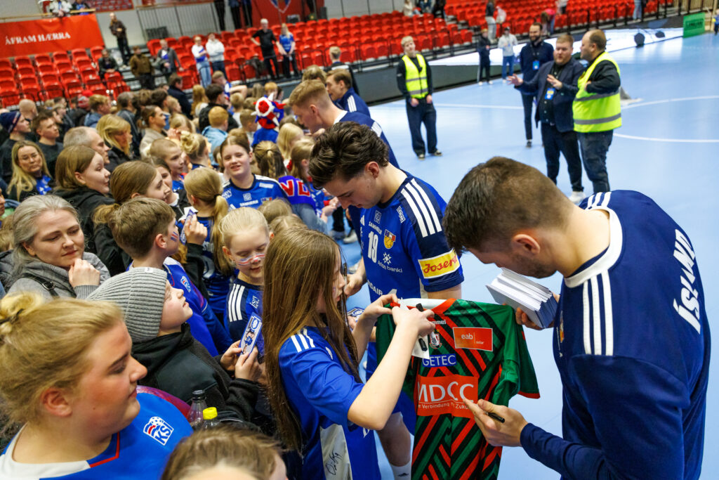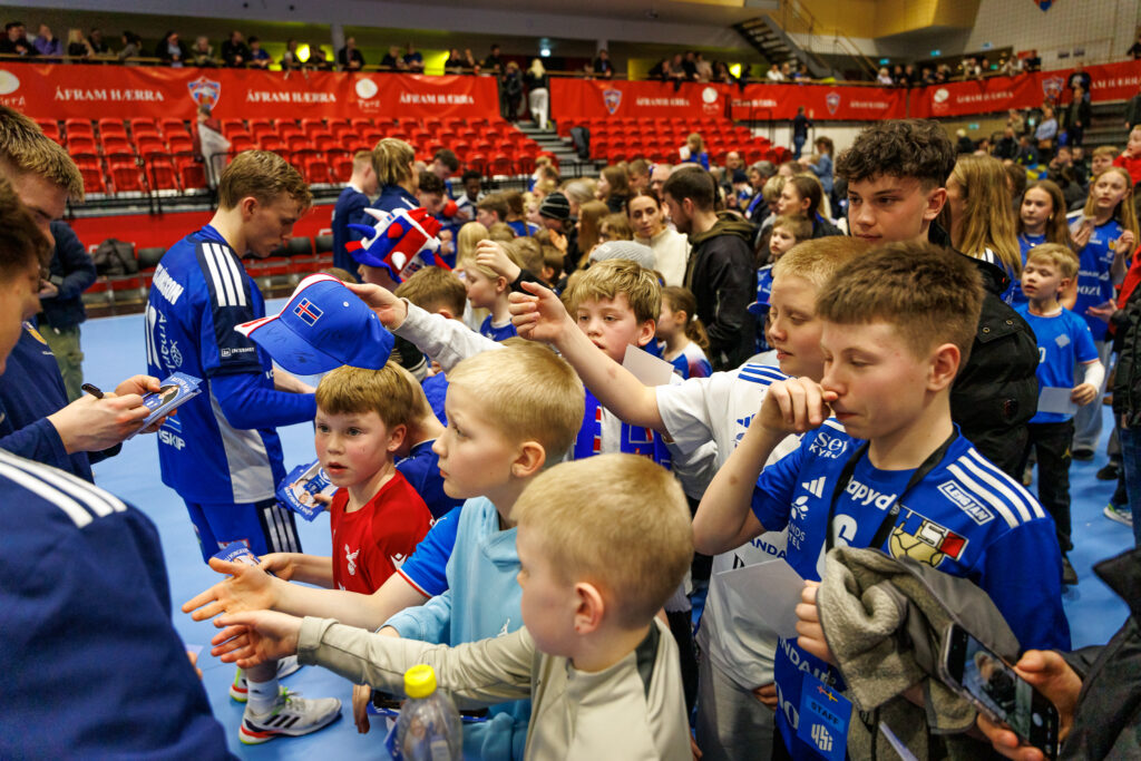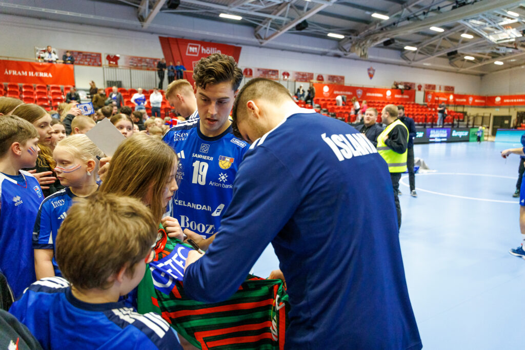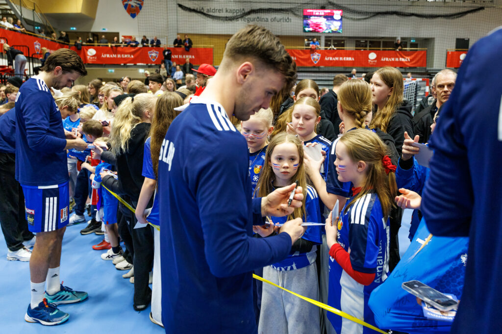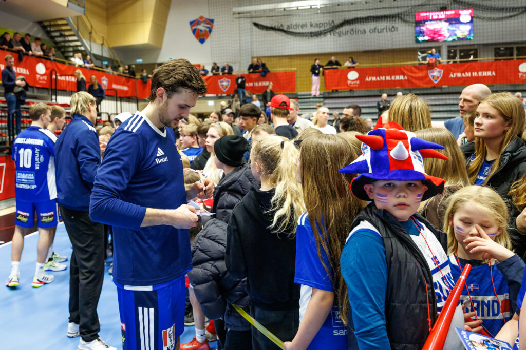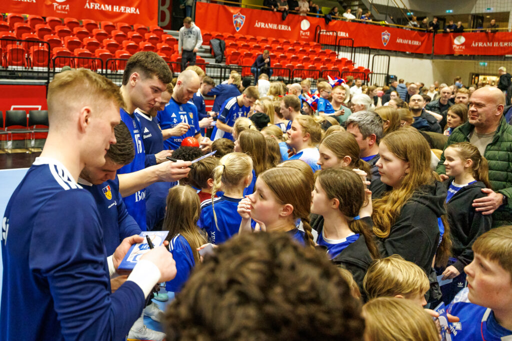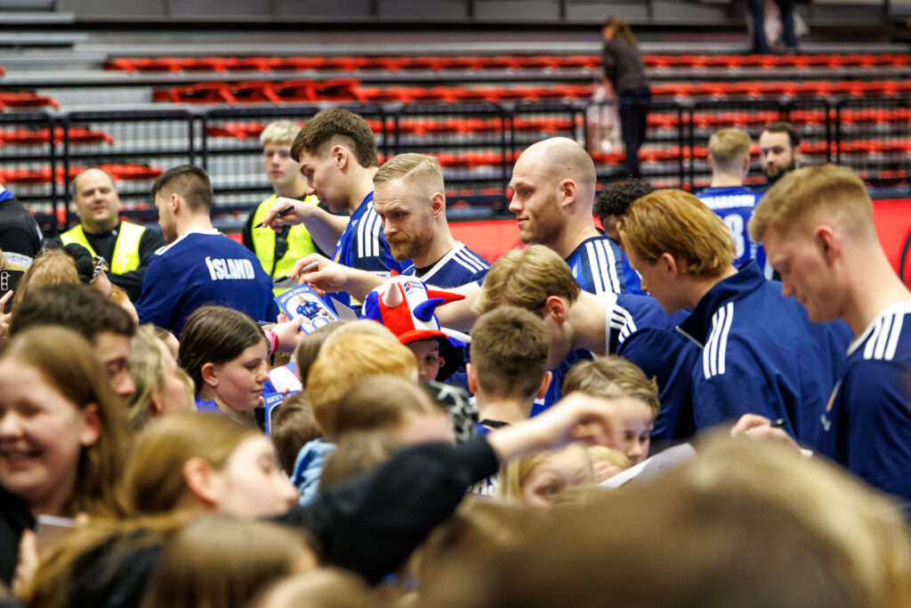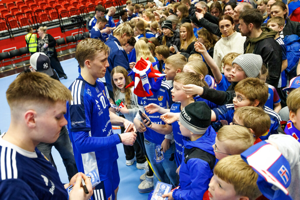 Strax að loknum landsleik Íslands og Svíþjóðar í handknattleik karla í N1-höllinni á Hlíðarenda í gærkvöld hittu leikmenn íslenska landsliðsins unga jafnt sem eldri stuðningsmenn.