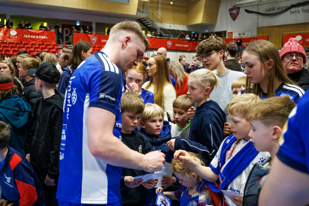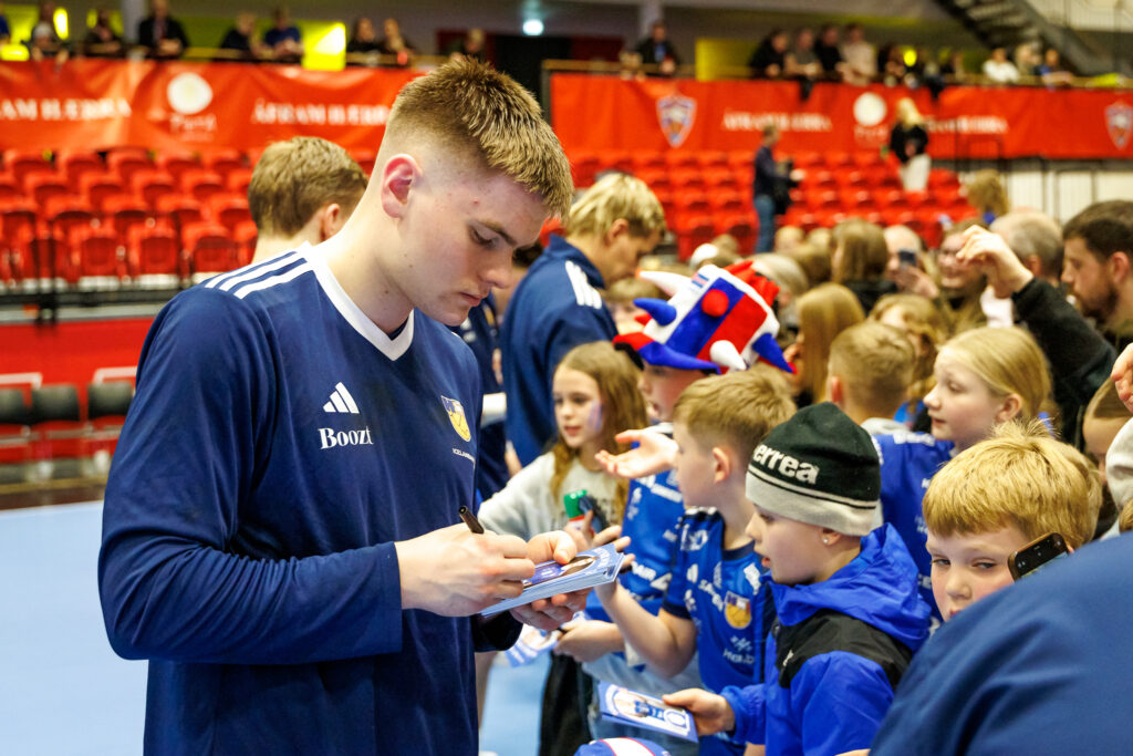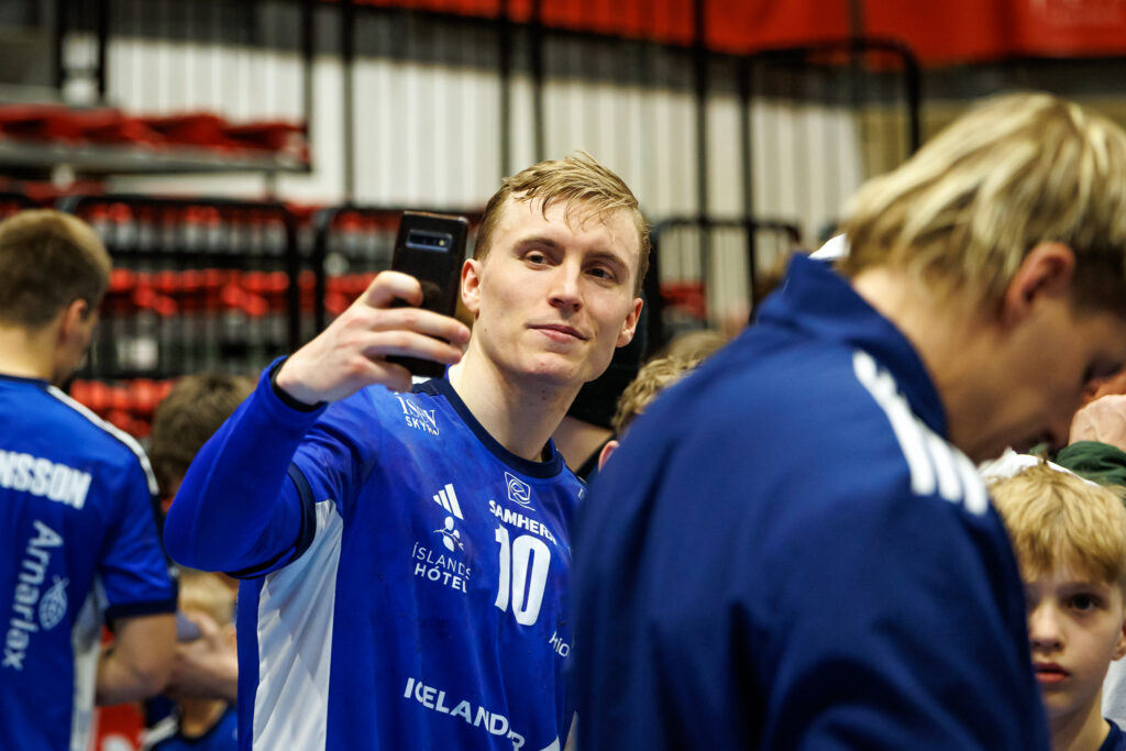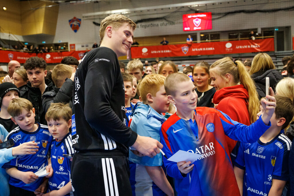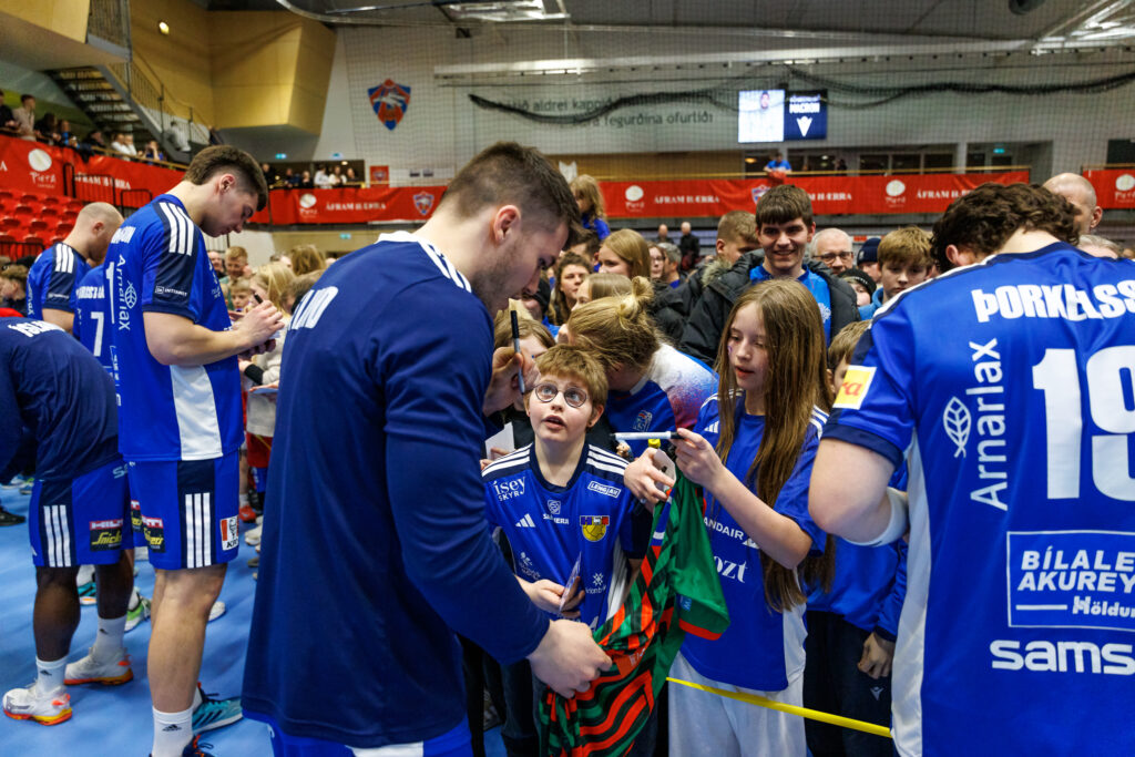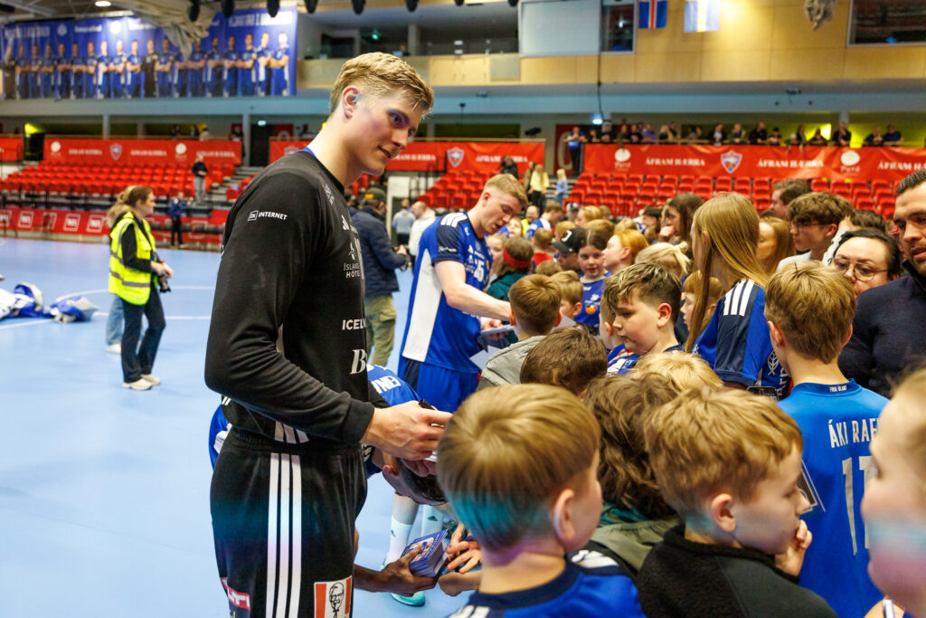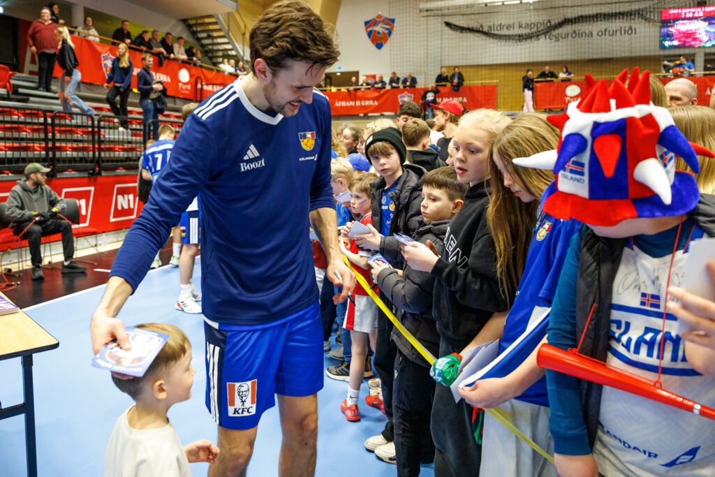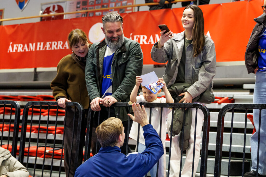 Strax að loknum landsleik Íslands og Svíþjóðar í handknattleik karla í N1-höllinni á Hlíðarenda í gærkvöld hittu leikmenn íslenska landsliðsins unga jafnt sem eldri stuðningsmenn.