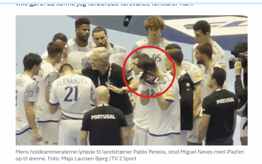 Einkennilegt atvik átti sér stað í síðasta leikhléi sem tekið var í viðureign Noregs og Portúgal á Evrópumóti karla í handknattleik þegar einn leikmanna portúgalska liðsins, Miguel Neves, gerðist njósnari. Hann lagði spjaldtölvu upp á að öðru eyra sínu og reyndi að hlera hvað þjálfari Norðmanna sagði við leikmenn sína. Leikhléið varð tekið 37 sekúndum fyrir leikslok í jafnri stöðu, 35:35.