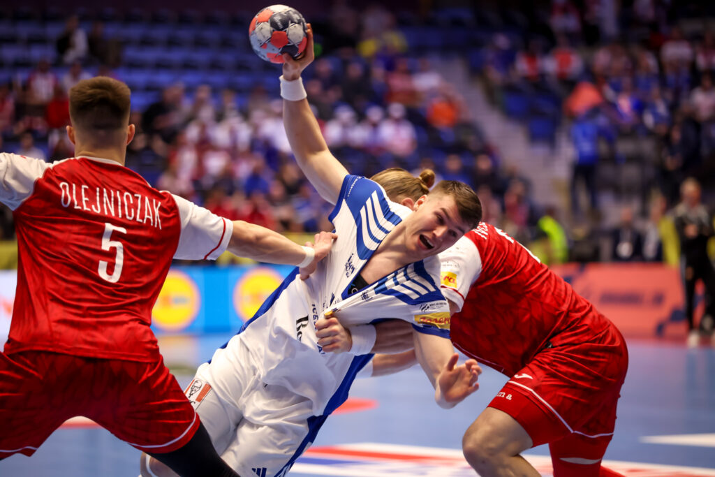 Leikurinn var hálfgerður barningur af hálfu íslenska landsliðsins allan fyrri hálfleikinn. Þrátt fyrir að möguleikar væru fyrir hendi til að hrista stóra og sterka Pólverja af sér þá tókst það ekki fyrr en á allra síðustu mínútum. Sóknarleikurinn gekk ekki sem skildi. Pólverjar sóttu langt út á móti íslensku sóknarmönnunum, boltar töpuðust og opin færi fóru forgörðum. Það var ekki fyrr en Haukur Þrastarson kom inn á völlinn á 21. mínútu sem aðeins lifnaði yfir sóknarleik íslenska liðsins. Haukur skoraði tvö mörk, vann vítakast, átti stoðsendingu sem skilaði marki og vann boltann einu sinni í vörninni. Frammistaða hans lagði grunn að þriggja marka forskoti í hálfleik, 13:10.