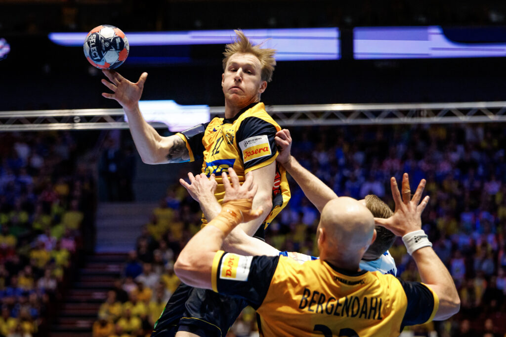 Eric Johansson sendir boltann á línumanninn Oscar Bergendahl í viðureign Íslands og Svíþjóðar á EM. Ljósmynd/Hafliði Breiðfjörð
